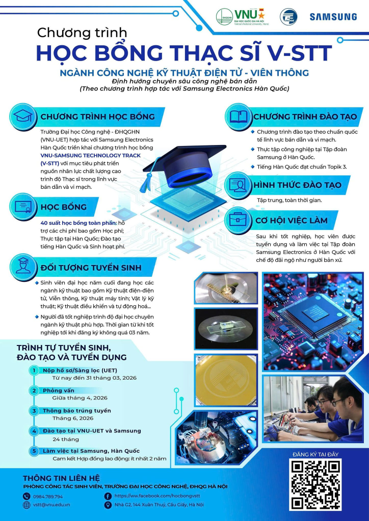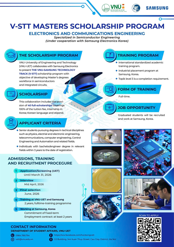 Trường Đại học Công nghệ – Đại học Quốc gia Hà Nội thông báo tuyển sinh Chương trình học bổng Thạc sĩ toàn phần V-STT – định hướng công nghệ bán dẫn với sự phối hợp của Samsung Electronics.